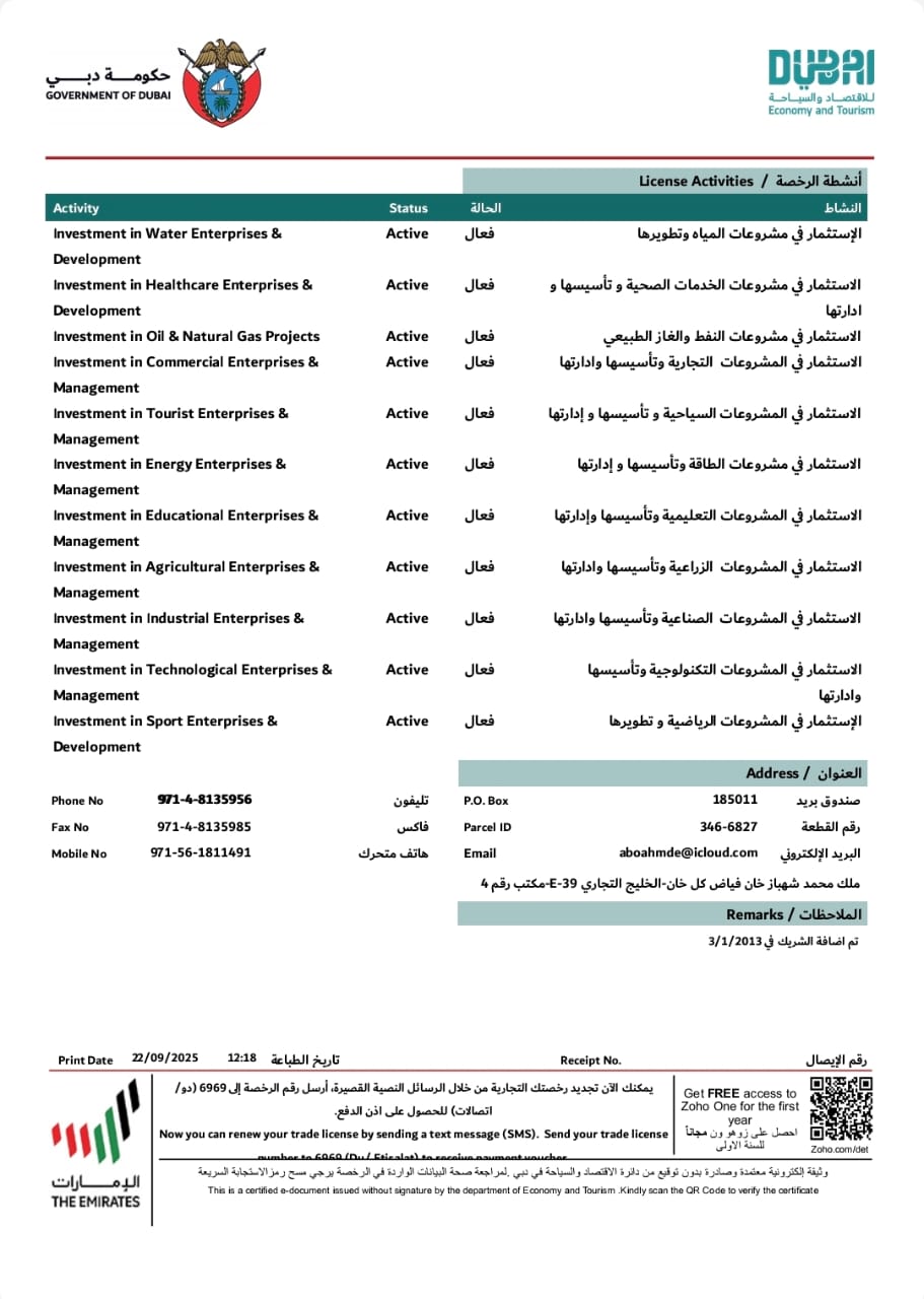 He founded a private company for gold and jewelry trading in the UAE, specializing in selling gold bars of different purities. He is also active in various fields, including: